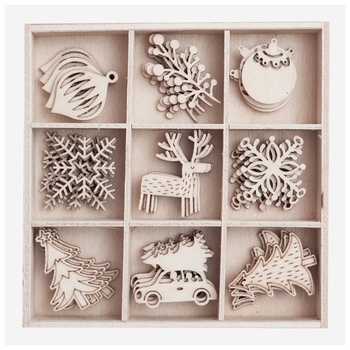 Drveni elementi se spakirani u praktičnu drvenu kutiju, u kojoj svaki oblik ima svoje mjesto. U prakiranju ćete naći tačno 45 komada lijepih dekoracija sa 9 zimskih i novogodišnjih motiva, od svakog po 5 komada. Ukrasi se mogu koristiti odmah ili se mogu dorađivati različitim hobby tehnikama.