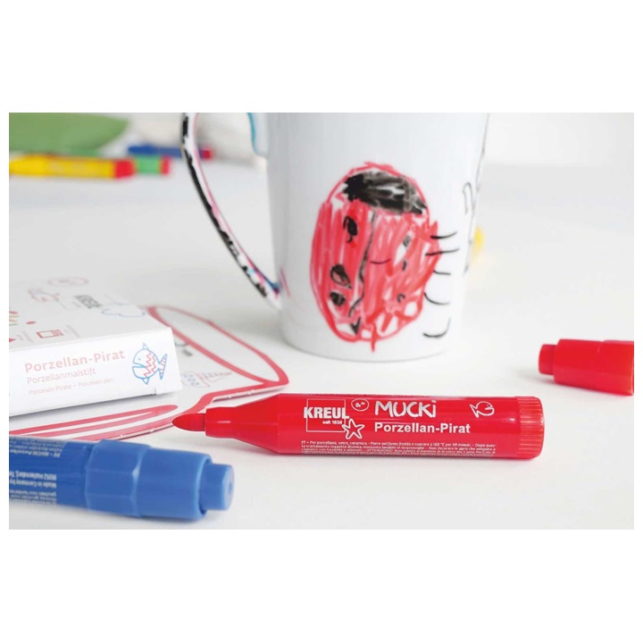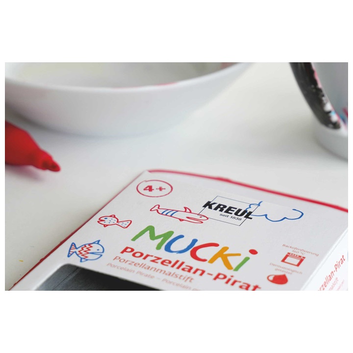 Set flomastera za porculan MUCKI pogodan je proizvod za sve kreativne aktivnosti u kojima možete uživati sa svojom djecom. Pomoć 5 živih boja - žuta, crvena, zelena, plava i crna, možete napraviti interesantne slike u boji. Flomasteri su na bazi vode i imaju izdržljivi vrh, koji mogu koristiti i mlađa djeca, bez problema. Flomasteri su pogodni za dekoriranje površina kao što su porculan, staklo i keramika, koje su prethodno očišćenje od prašine i nečistoća. Nakon crtanja bit će potrebno oko 4 sata da se boje na predmetu osuše. Nakon toga, predmet treba staviti u nezagrejanu pečnicu, podesiti temperaturu na 160 °C, i peći ga 90 minuta kako bi se boje fiksirale. Nakon toga treba isključiti pečnicu i predmet ostaviti u njoj dok se ne ohladi. Nakon ovakvog fiksiranja boje postaju vodootporne i predmet se može prati u mašini za suđe. Pri slikanju treba izbjegavati površine koje će dolaziti u direktan kontakt s hranom ili ustima. Proizvod nije pogodan za djecu do 3 godine. Ne sadrži parabene, gluten ili laktozu.