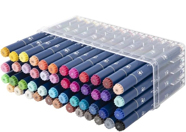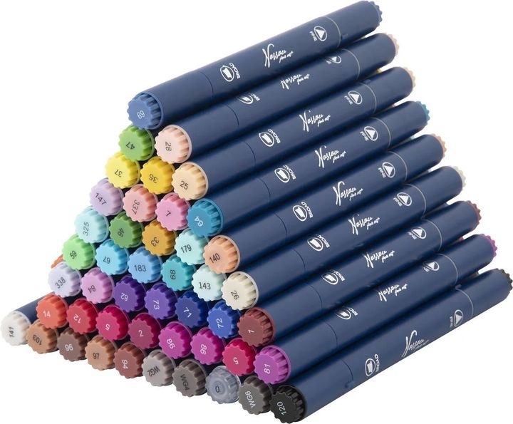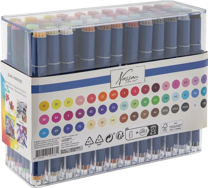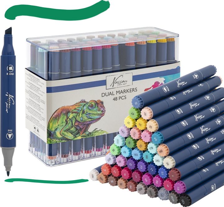 Set dvostranih markera Nassau Fine Art jedan je od savršenih alata za djecu i umjetnike iz hobija. Set dvostranih markera sa 47 živih boja i bezbojnim blenderom! Svaki marker ima i širok i fin vrh, pružajući maksimalnu svestranost za sva vaša umjetnička djela. Široki vrh idealan je za popunjavanje velikih površina, dok fini vrh omogućuje precizan rad s detaljima i linijama. Markeri su idealni za razne projekte uključujući bojanje, skiciranje, kaligrafiju i više. Tinta na bazi alkohola koja se brzo suši može se miješati kako bi se stvorili prekrasni prijelazi i efekti. Bezbojni blender omogućuje glatke prijelaze boja i mogućnost posvjetljivanja ili miješanja boja. Markeri su dizajnirani s ergonomskim trokutastim tijelom za udobno držanje i preciznu kontrolu.