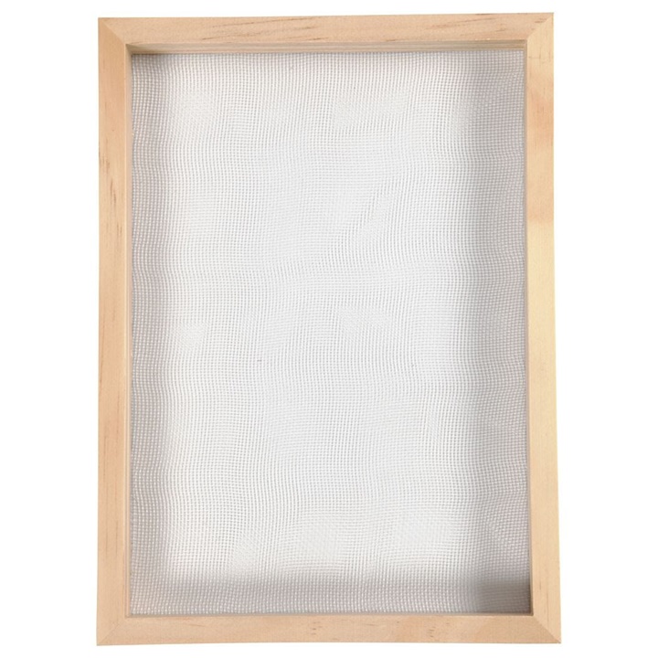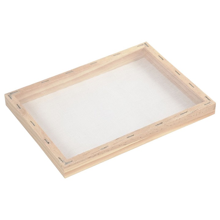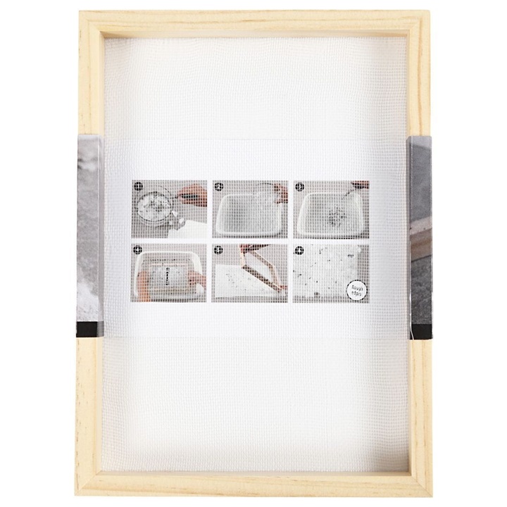 Sito na okviru je neophodna alatka u izradi handmade papira. Drveni okvir izrađen je od drveta bora i ima dimenzije 23 x 17 cm, što je adekvatno za proizvodnju papira formata A5. Plastična mreža je pričvršćena na okvir čeličnim zakivačima, pa nema bojazni da će pri upotrebi zarđati i oslabiti. Uput za korištenje proizvoda i izradu hartije pronaći ćete na poleđini pakovanja.